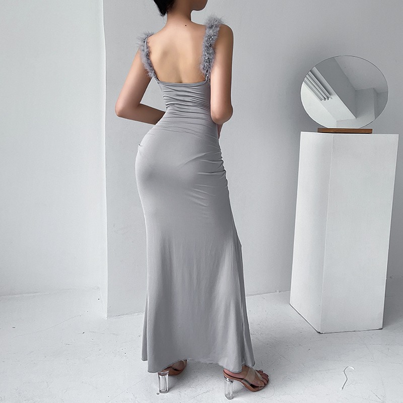 Designed to command the room from the moment you enter, the Platinum Siren Feather Touch In Silver is a masterclass in ethereal, modern elegance. This piece pairs a flawlessly sculpted, body-hugging silhouette in a striking, light-catching grey-silver tone with luxurious, feather-embellished shoulder straps. The masterful front ruching cinches the waist and flatters your natural curves, while the dramatic thigh-high slit adds a fierce, elongating finish to the sweeping maxi length.